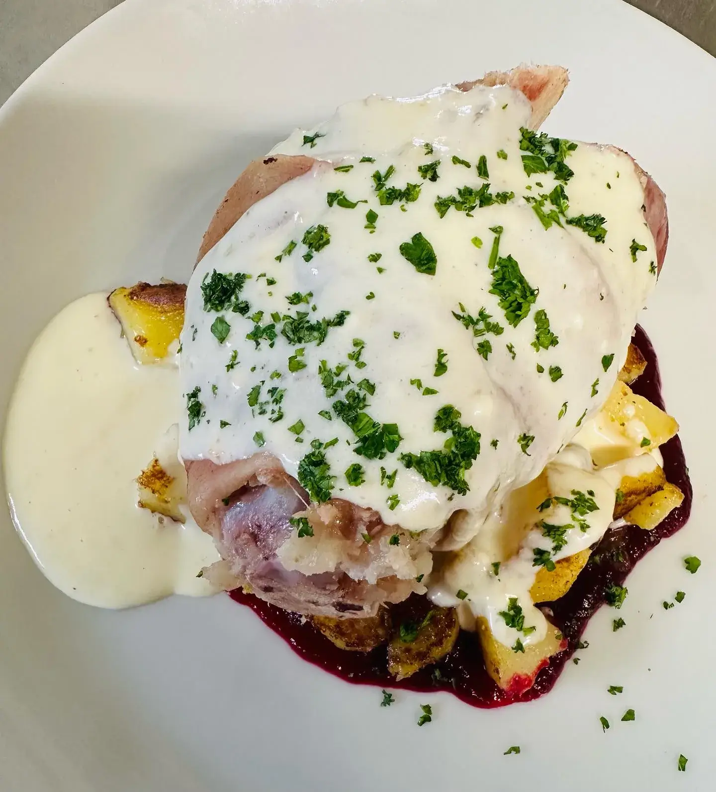 Le jambonneau au Munster est un véritable délice, parfait pour les amateurs de cuisine traditionnelle. Ce plat généreux allie la tendreté du jambonneau à la puissance du fromage Munster, un incontournable de la région. Accompagné de pommes de terre et d’une touche de charcuterie, il offre un équilibre de saveurs qui ravira vos papilles. Ce plat, préparé avec soin, reflète l’esprit chaleureux et authentique de la cuisine vosgienne.